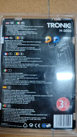 Set manos libres para moto marca Tronic, modelo H-3050. Incluye dos auriculares y el módulo de control. Y cable mini jack para reproducir musica. - Auriculares con diseño para interior del casco. - Módulo de control con interruptor ON/OFF y control de volumen. - Conexiones jack estándar. Incluye cable para conectar mp3, ipod,movil por mini jack