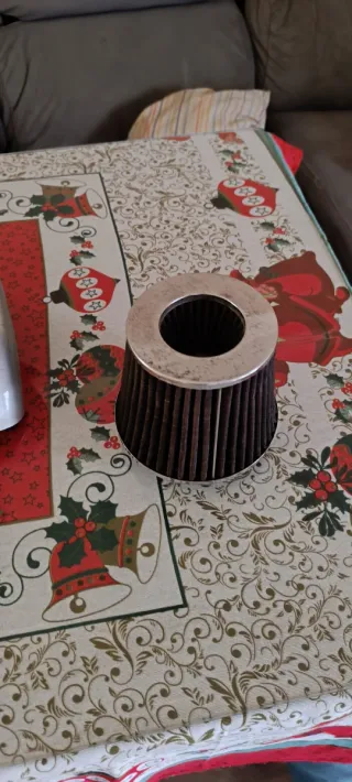 Filtro de aire cónico para coche, con un diseño que mejora la admisión. - Boca de conexión de goma. - Aro metálico de sujeción. - Filtro de tela plisada.