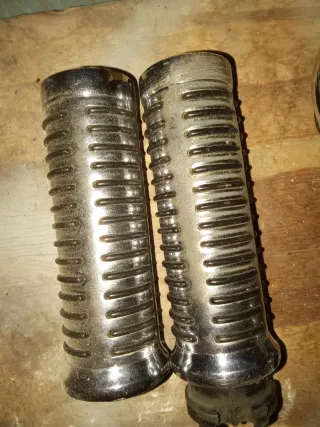 Set de dos puños custom para motocicleta con acabado cromado y detalles en goma. - Diseño clásico y elegante. - Materiales resistentes para mayor durabilidad. - Estaban en una fat boy. Cambio por cambio de color de la moto.