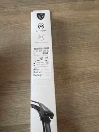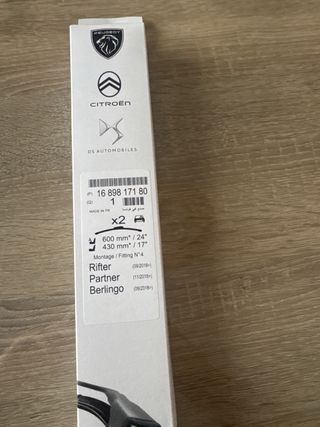 Juego de escobillas delanteras para vehículos del grupo PSA. - Referencia: 16 806 171 60 - Incluye 2 escobillas: 600 mm / 24 y 430 mm / 17 - Compatibles con Citroën Rifter, Partner y Berlingo.
