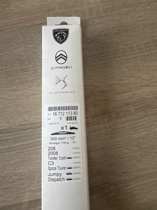 Escobilla limpiaparabrisas trasera para varios modelos del grupo PSA. - Referencia: 16 712 113 80 - Longitud: 300 mm / 12 - Compatible con: Peugeot 208, 2008, Traveller Expert; Citroën C3, Space Tourer, Jumpy, Dispatch.