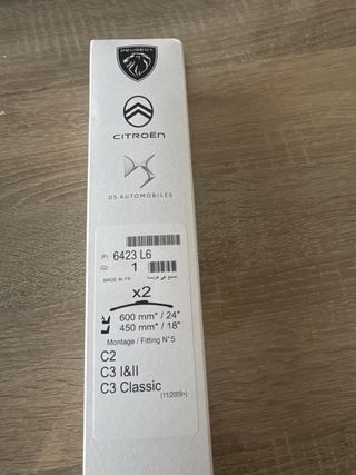 Juego de escobillas delanteras para Citroën. - Incluye dos escobillas: 600 mm y 450 mm. - Referencia: 6423 L6. - Compatibles con Citroën C2 y C3 (modelos I & II, C3 Classic).
