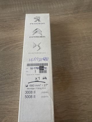 tengo la escobilla del conductor también en venta, avisar para hacer pack. Escobilla limpiaparabrisas delantera para vehículos PSA. - Longitud: 425 mm / 17 pulgadas. - Referencia PSA: 16 898 160 80. - Compatible con modelos: 3008 II, 5008 II, C5 Aircross, DS7.