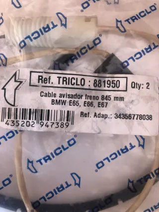 Cable avisador de freno TRICLO para BMW E65, E66, E67. Referencia TRICLO 881950. - Longitud: 845 mm. - Referencia de adaptación: 34356778038. - Cantidad: 2 unidades.