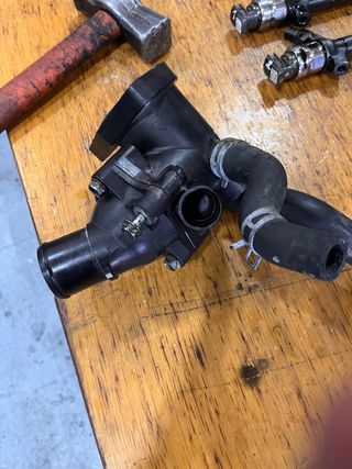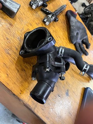 Termostato para Toyota D4D. Pieza de recambio para el sistema de refrigeración. - Carcasa de plástico negro. - Incluye manguera de goma con abrazaderas.