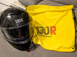 Casco de moto integral con acabado en fibra de carbono de la marca 130R. Incluye bolsa de transporte. - Diseño deportivo y ligero. - Cierre de doble anilla. - Visera clara. - Interior cómodo y extraíble.