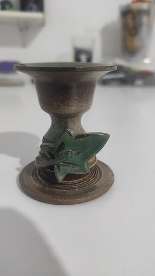 Soporte para vela hecho de barro. En color marron y verde con una hoja decorativa. Medidas: 7 cm de alto, 5 cm de base superior y 5 cm de base inferior. Nuevo. hogar, decoración, luz, calidez, vela, llama, anmbiente, casa, adorno