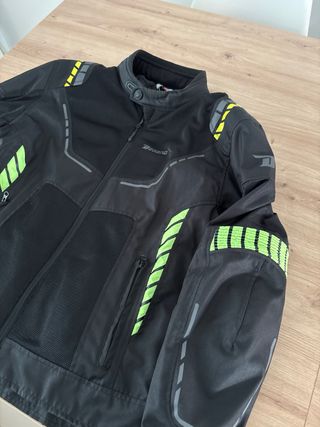 Chaqueta de moto negra con detalles de alta visibilidad. Esta nueva - Diseño moderno y funcional. - Incorpora protecciones en hombros y codos. - Paneles de malla para ventilación.