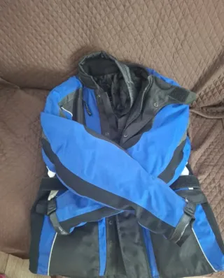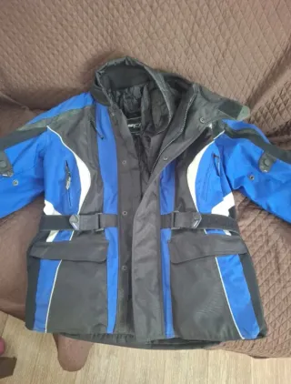 Chaqueta de moto SCR SCRATCH en color azul y negro. Diseñada para ofrecer protección y comodidad. - Talla L - Cierre frontal con cremallera y solapa. - Bolsillos frontales con solapa y cierre. - Cinturón ajustable con hebilla. - Puños ajustables con velcro. - Cuello alto con forro interior.