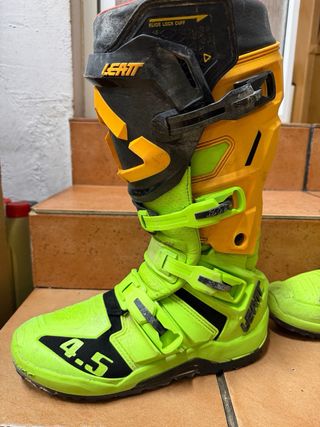 Botas de enduro Leatt modelo 4.5 en color amarillo y verde neón. - Cierre con hebillas. - Diseño robusto y protector. - Talla 45.5 Se venden dos pares de botas con 5 salidas , con suela de hard enduro que me costaron 100€ + cada par de botas SE VENDE LOS DOS PARES , NO SE VEDEN SUELTAS