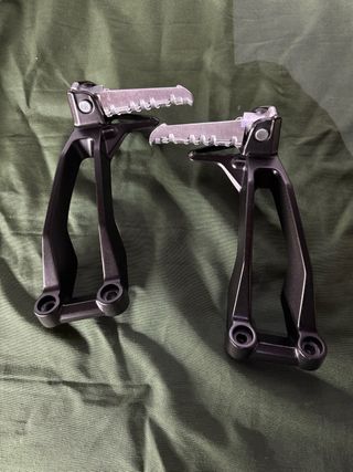 Estriberas traseras para Yamaha Tracer 900. Fabricadas en aluminio negro con superficie antideslizante. - Material: Aluminio. - Color: Negro. - Diseño: Plegable.