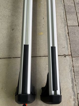 Barras de techo de aluminio para BMW. Diseñadas para un ajuste seguro y aerodinámico. - Material: Aluminio. - Color: Plateado y negro.