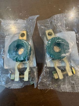 Par de interruptores desconectadores de batería universales. Permiten cortar la corriente de la batería de forma rápida y segura. - Fabricados en latón. - Incluyen tuerca y tornillo de sujeción. - Diseño con rueda giratoria para fácil operación.