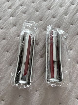 Set de dos embellecedores para el freno de mano, uno con acabado imitación madera y otro con diseño de fibra de carbono. - Embellecedor con acabado imitación madera y detalles cromados. - Embellecedor con diseño de fibra de carbono y detalles cromados.