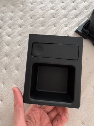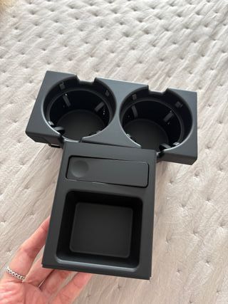 Portavasos doble para la consola central de un BMW Serie 3. Fabricado en plástico negro mate. - Diseño integrado para la consola. - Dos compartimentos para bebidas.