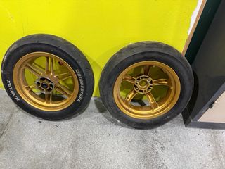 Se vende juego de llantas para jog circuito o competición delantera original aligerada y trasera de rally . Recién pintadas en doradas con gomas britgestone