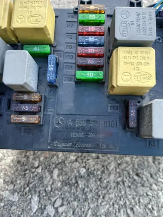 Módulo de fusibles y relés para Mercedes Viano W639. - Referencia: A 639 545 0101 - Fabricante: TEMIC - Incluye varios fusibles y relés.