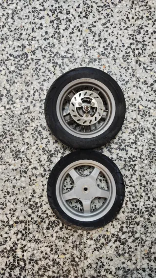 Juego de ruedas para Derbi Atlantis. El neumatico trasero tiene unas rajas, aparentemente no parece que esten pinchadas, son superficiales. Neumaticos michelin, medidas; trasera 12 - 120/70 y delantera 12