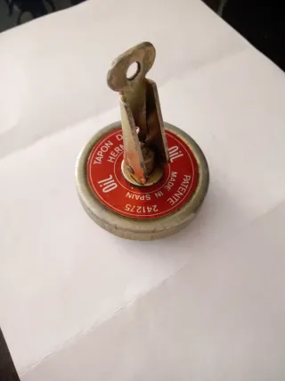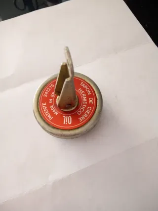 Tapón de llenado de aceite para motores Renault antiguos. Presenta un diseño circular con la inscripción OIL en el centro y Tapon de Cierre Hermetico alrededor. Válido para Renault 12 y Renault 8, pero válido para otros modelos - Inscripción PATENT y número 241275. - Fabricado en España.