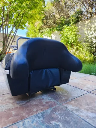 Top case Custom Aces en color negro, en buen estado. - Acabado brillante. - Incluye parrilla cromada. - Diseño elegante. - Con soportes - Estaba montado en una Suzuki intruder 1500lc. - Gran capacidad