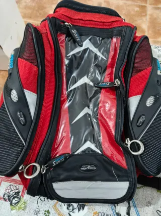 Bolsas de depósito para moto de la marca Oxford. - Color rojo y negro. - Diseño deportivo con detalles transparentes. - Cremalleras con tiradores. - Anillas metálicas.