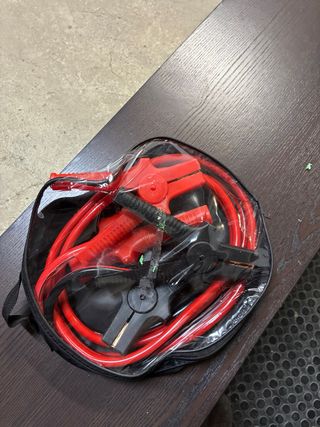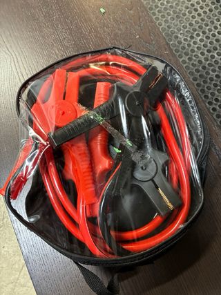 Cables de carga para batería de coche, también conocidos como cables de arranque o pinzas de puente. - Pinzas de conexión de color rojo y negro. - Incluye bolsa de transporte con cremallera.