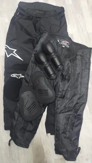 Equipación de moto Alpinestars en talla L. Incluye pantalones y protecciones. - Pantalones de moto negros. - Protecciones para rodillas y caderas. - Marca Alpinestars.