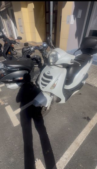 Scooter Daelim Besbi de 125cc en color blanco. Ideal para moverse por la ciudad con agilidad. Maletero trasero incluido. Rueda trasera cambiada. Tiene un par de roces como se ve en las fotos. Único propietario, siempre en garaje. Se vende por no usar. Año de matriculación 2015, ITV hasta 2027 4.300km