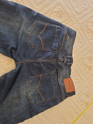 Pantalones vaqueros ajustados estilo moto. Son de color azul oscuro y presentan un buen estado. - Diseño ajustado a la pierna. - Cierre de cremallera. - Bolsillos funcionales.
