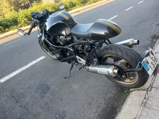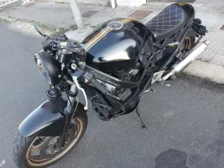 Moto estilo cafe racer, lista para circular. - Diseño único con detalles dorados. - Asiento con patrón de rombos. - Homologada
