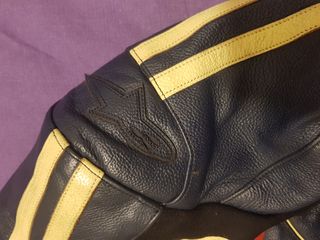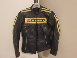 Chaqueta de moto de piel con diseño deportivo. - Color azul marino con detalles en beige y rojo. - Logo de Alpinestars en el pecho. - Cierre de cremallera frontal. - Mangas con rayas beige. - Protecciones en hombros y codos -Talla 42 seria para una M. Pecho tallas 95-100