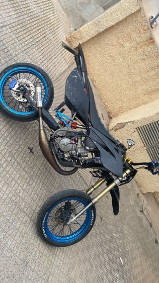 Moto KTM 450cc estilo supermotard. La moto lleva viela cadena ,carteres y pistón nuevo. Ruedas supermotar homologadas. Se entrega todo lo de serie para pasar ITV , otro escape fmf , el mivv que lleva puesto y el de serie. La moto arranca y funciona pero suena un ruido arriba posible desajuste del árbol de levas o reglaje de válvulas.