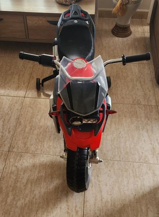 Moto BMW eléctrica para niños, con un diseño deportivo y llamativo. - Color rojo y gris. - Ruedas de goma. - Manillar con puños de goma para un mejor agarre.
