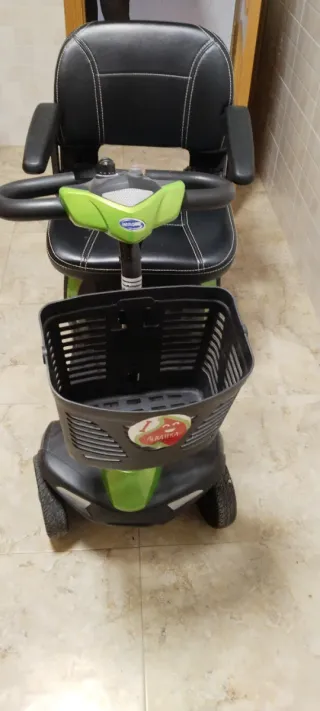 Silla de movilidad reducida en color negro y verde. Batería nueva Está como nueva 4 ruedas( no vuelca como las de 3 ruedas). - Asiento acolchado. - Reposabrazos. - Cesta delantera. - Ruedas delanteras y traseras.