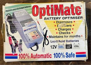 Cargador de baterías OptiMate III para plomo-ácido de 12V. Incluye manual de instrucciones. - Indicadores LED para estado de carga. - Conexión a red eléctrica 220-240V. - Pinzas de conexión para batería.