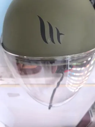 Casco de moto de color verde con un diseño moderno y una visera transparente. - Diseño de logo en la parte superior. - Visera de protección.