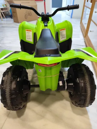 Quad infantil marca Kawasaki en color verde. Se encuentra en perfecto estado. Se compró de regalos de reyes pero mi niño quería una moto. Se habrá usado 2 veces. - Diseño deportivo. - Ruedas todoterreno.