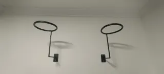 Soporte de pared metálico para colgar cascos de moto. Diseñado para fijarse a la pared de forma segura. - Estructura de metal negro. - Aro para colgar el casco.