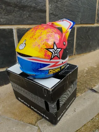 Casco para niño con diseño llamativo. Edad de 4 a 6 años. NUEVO A ESTRENAR - Estilo cross. - Colores vibrantes: rojo, amarillo y azul. - Decoración con estrellas y un gran logo en forma de estrella.
