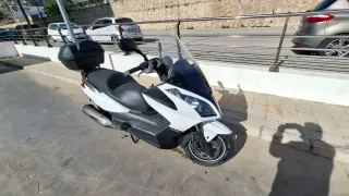 Escúter de color blanco marca kymco. Modelo Superdink 300. - Incluye un baul negro en la parte trasera con capacidad para dos cascos integrales. - Parabrisas para mayor proteccion en invierno. - Neumáticos a un 70% de su uso. - Aceite y filtros cambiados hace 1000km. - Asiento con capacidad para dos cascos. - Consumo entre un 4 y un 4,5%. Escúter muy práctico y para la cilindrada un consumo muy reducido, y en un estado perfecto.