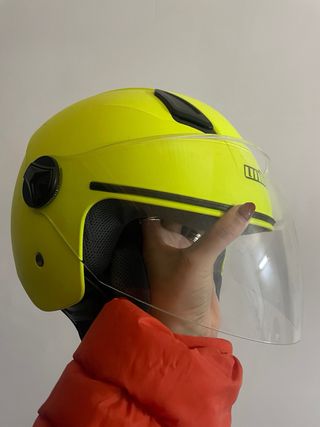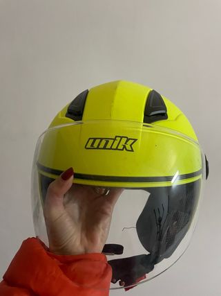 Casco de moto de la marca Unik, en color amarillo brillante y con poco uso. Ideal para protegerte en tus desplazamientos. - Diseño moderno y llamativo. - Visera transparente. - Interior cómodo.
