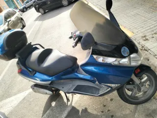 Scooter Piaggio X8 125cc del 2006, una moto usada pero con pocos kilómetros, que funciona perfectamente y acaba de pasar por una revisión y reparación completa para su venta *15cv *34.000 kms *itv hasta Noviembre 2027 *color azul *maleta trasera *neumáticos, frenos, luces, pulsadores, motor, embrague, arranque, temperatura y amortiguación en buen estado *visualmente desgastada, con arañazos en un lateral, en la maleta y una raja en la tela del asiento *batería nueva de 50€, aparece en la factura de la foto *liquido refrigerante, frenos y aceite nuevos, manguitos, pulsadores etc, todo lo que aparece en la factura de la última foto