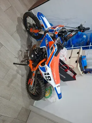 Moto infantil de cross con un diseño deportivo en colores naranja y azul. Sin rodaje echo seminueva de 125 cc mas informacion 674689620 - Chasis robusto. - Ruedas todoterreno. - Asiento cómodo.