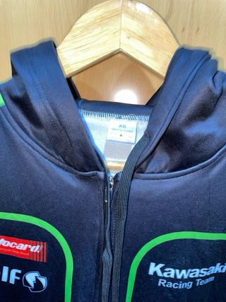 Sudadera con capucha del equipo Kawasaki Racing Team. - Color negro con detalles en verde. - Cierre de cremallera. - Bolsillo frontal. - Logo de Kawasaki Racing Team.