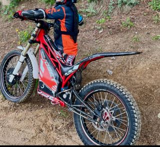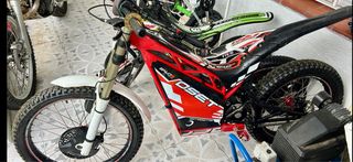 Moto de trial OSET 24.0R modelo eléctrico. Bateria modificada de litio 72v centralita Beta moto niño trial enduro cross motocross campo montaaña Toni Bou - Color rojo y blanco. - Ruedas de trial.