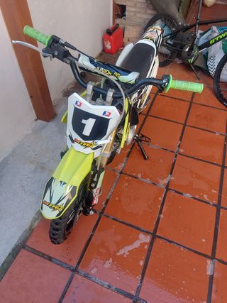 Moto de cross con diseño deportivo en azul y blanco. - Número 1 en el frontal. - Llantas todoterreno. tiene un cayo es el acelerador.  y viene el casco y el guante y tengo la garrafa de la gasolina llena,
