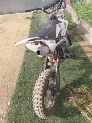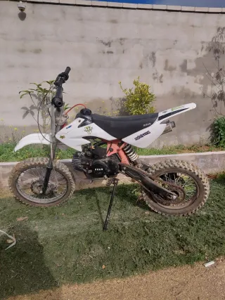 Moto de campo de 125cc, ideal para iniciarse en el off-road. Diseño deportivo y robusto. - Color blanco y detalles en negro. - Ruedas todoterreno. - Suspensión trasera visible.