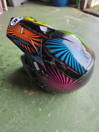 Casco de moto HJC con un diseño llamativo. - Color base negro con detalles en rosa y otros colores. - Estilo deportivo para enduro y motocross.