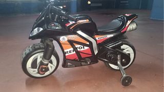Moto eléctrica infantil con diseño deportivo. - Ruedines de apoyo incluidos. - Decoración inspirada en el equipo Repsol. - Voltaje de 12V. Edad recomendada de 3 a 6 años Velocidad de 5/6km/hora