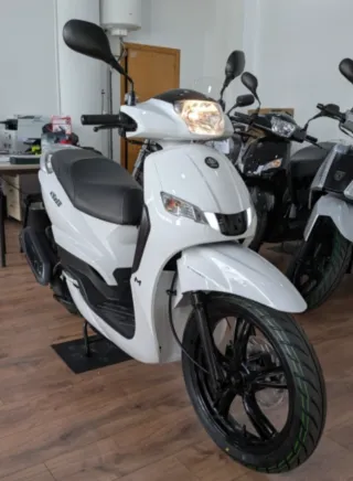 Moto tipo scooter en color plata. Un vehículo práctico y ágil para la ciudad. - Diseño moderno y elegante. - Ideal para desplazamientos urbanos.